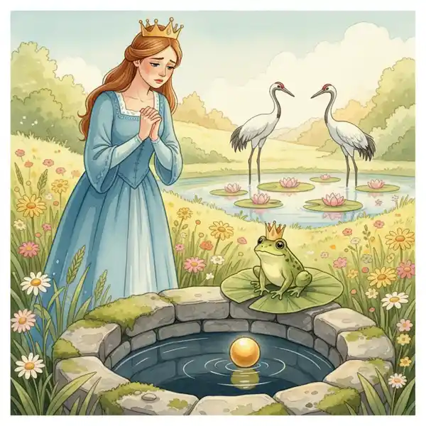 Eräänä päivänä pallo putosi syvään kaivoon. Prinsessa itki katkerasti.