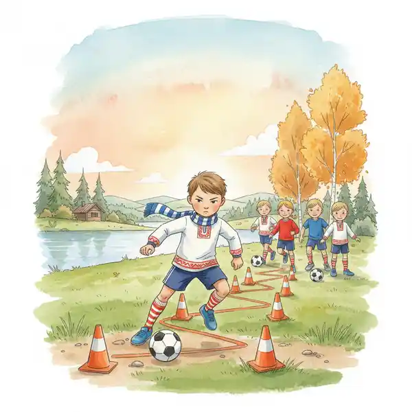 Eemeli alkoi liikkua pallon kanssa tavalla, jota kukaan ei ollut odottanut. Pallo näytti kiinnittyneeneen hänen jalkoihinsa. Se seurasi jokaista liikettä, jokaista kääntymistä, jokaista suunnanvaihdosta kuin se olisi ollut osa häntä. Hän tanssii kartioiden välistä kevyesti kuin tuulen lehti, pallo liukui saumattomasti hänen jalkojensa välillä.